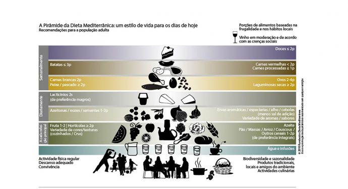 A Fundação Dieta Mediterrânea, instituição que tem como objetivo fomentar os valores do modelo alimentar, formalizou a Pirâmide da Dieta Mediterrânea, a qual faz recomendações de quantidade e frequência.