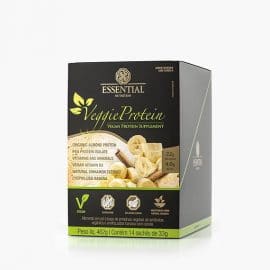 Combinação da proteína isolada da ervilha com a proteína da amêndoa com banana liofilizada e extrato de canela.